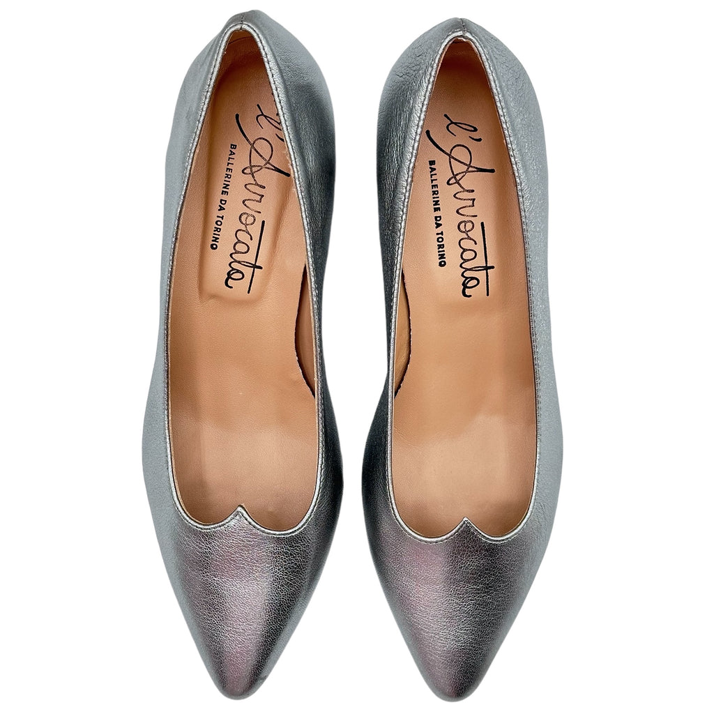 Allegra è il modello décolleté dell'Avvocata, a punta, con nuovo scollo a cuore e tacco a rocchetto foderato per un'altezza di 6 cm circa. La tomaia è in nappa, come la fodera interna e la soletta. La suola e in gomma.